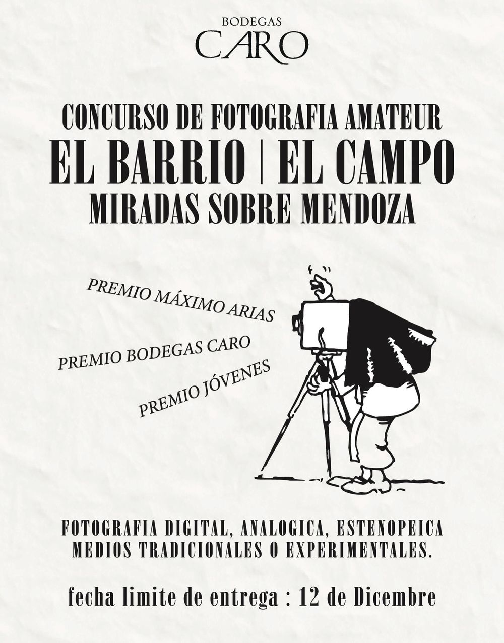 La convocatoria está dirigida a fotógrafos amateurs e incluye tres distinciones. El Premio Máximo Arias reconoce una imagen que ofrezca una mirada humana y espontánea del barrio o del campo mendocino. El Premio Bodegas CARO destaca una visión original del edificio histórico de la bodega en Godoy Cruz. El Premio Jóvenes Fotógrafos, destinado a menores de edad, impulsa perspectivas creativas y personales sobre la provincia.