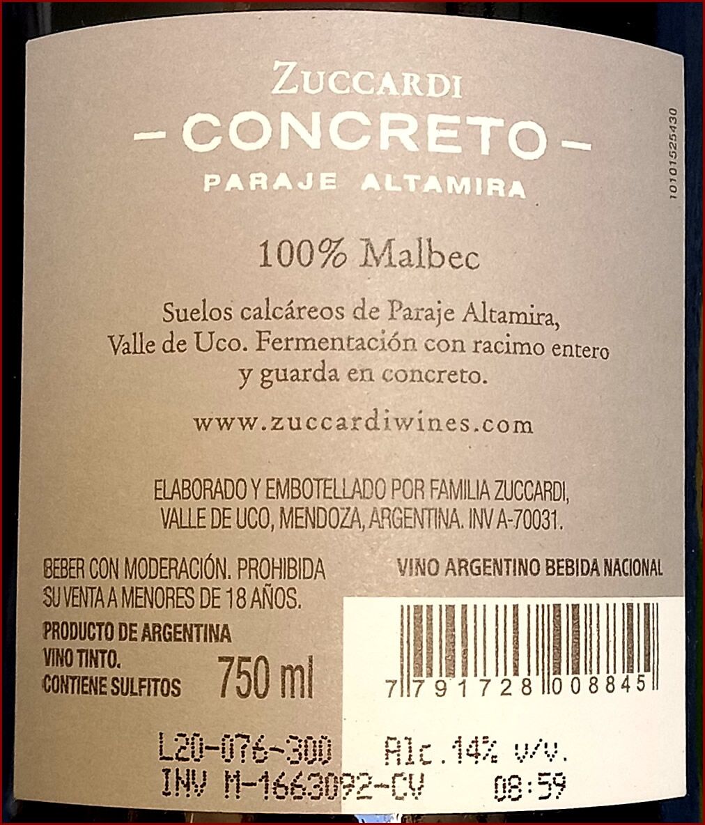 Vinificación: Fermentación en hormigón sin epoxi, con levaduras indígenas, maceración durante 20 días. Fermentación maloláctica y crianza en piletas de hormigón. Parte del vino se fermenta con racimo entero.