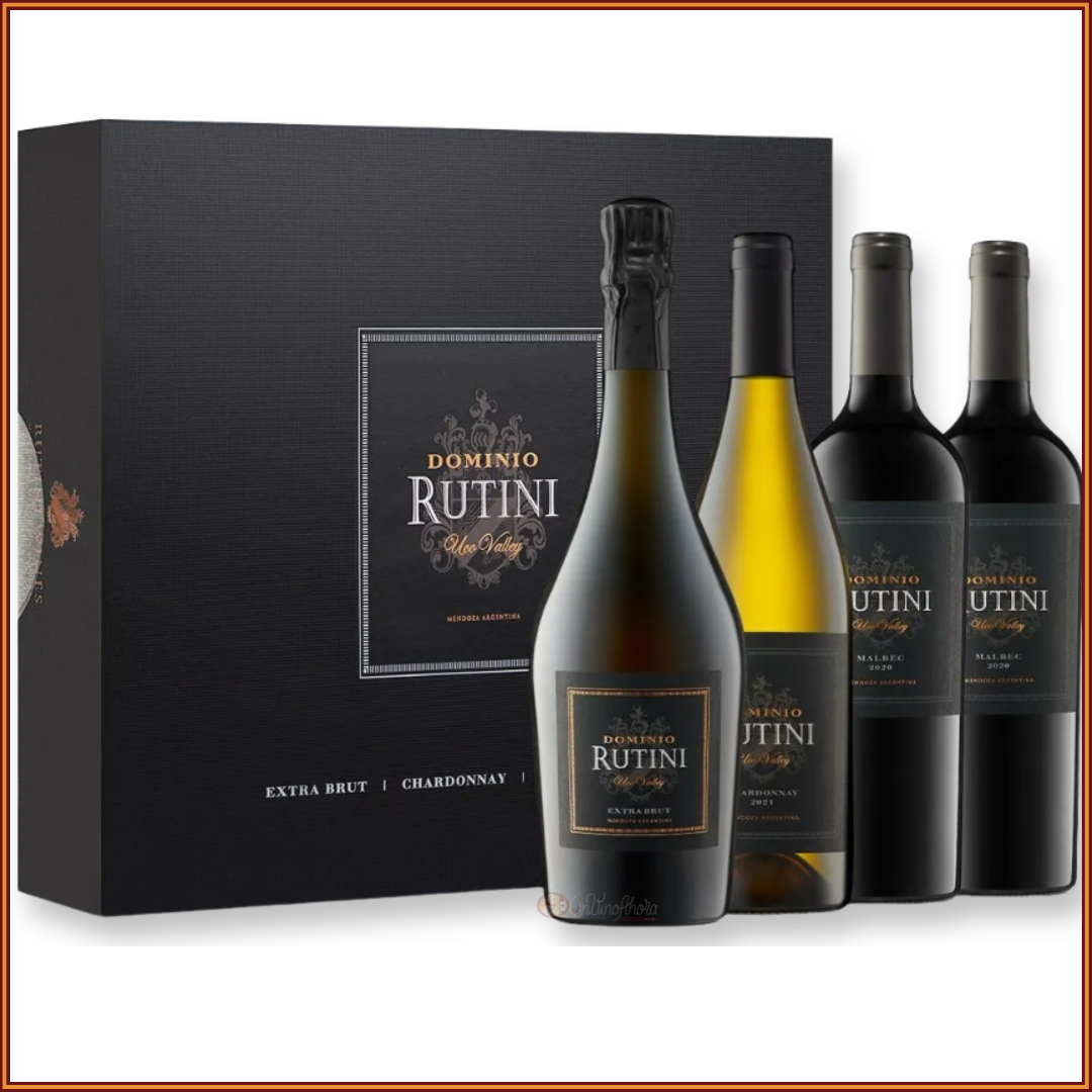 Estuche con 2 botellas de Dominio Rutini Malbec y una botella de Dominio Rutini Chardonnay y una de Dominio Rutini Extra Brut