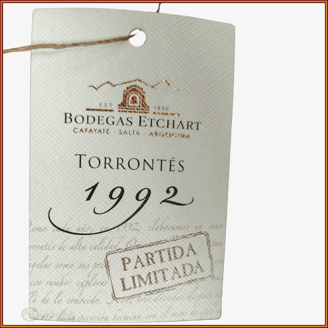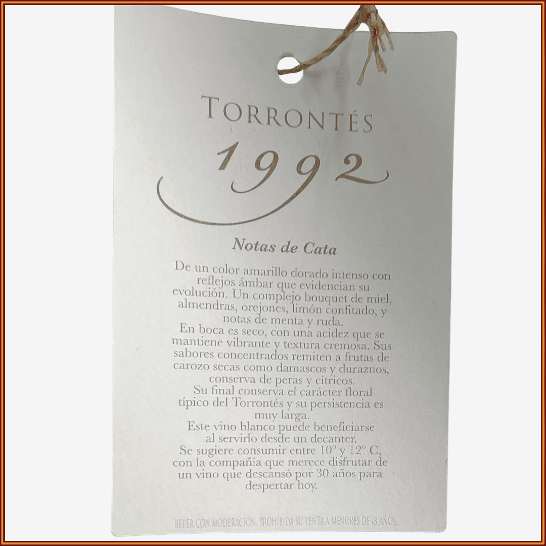 Notas de Cata: de color amarillo dorado intenso con reflejos ámbar que evidencian su evolución. Un complejo bouquet de miel, almendras, orejones, limón confitado y notas de menta y ruda. Seco en boca, con una acidez que se mantiene vibrante y textura cremosa. Sus sabores concentrados remiten a frutas de carozo secas como dmascos y duraznos, conservas de peras y cítricos. Su final conserva el carácter floral típico del torrontés y su persistencia es muy larga.
