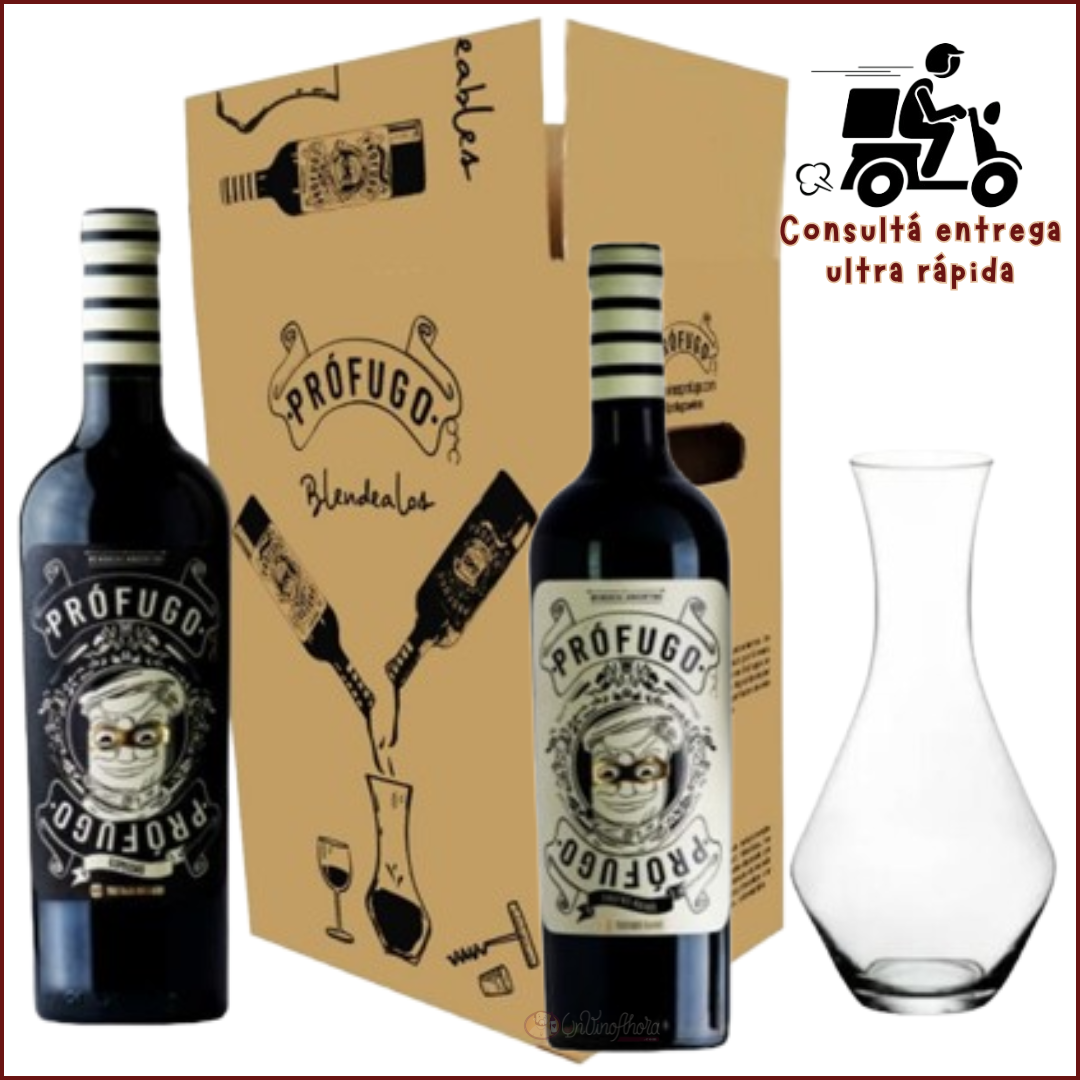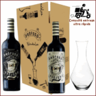 Caja con una botella de Prófugo Especias, una botella de Prófugo Frutos Rojos y un decanter de regalo